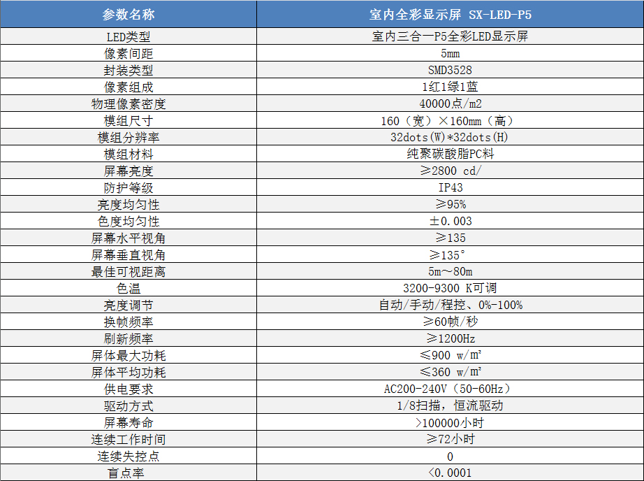 P5室內小間距高清全彩LED顯示屏技術參數: