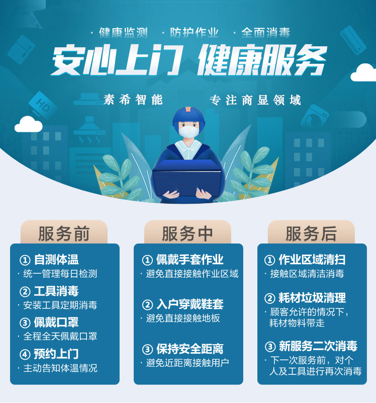 服務(wù)中:首先是要求佩戴手套作業(yè)以免直接接觸作業(yè)區(qū)域,其次進(jìn)入安裝場所后穿鞋套避免直接接觸地板,最后是和客戶們保持一定的安全距離,避免近距離接觸到客戶。